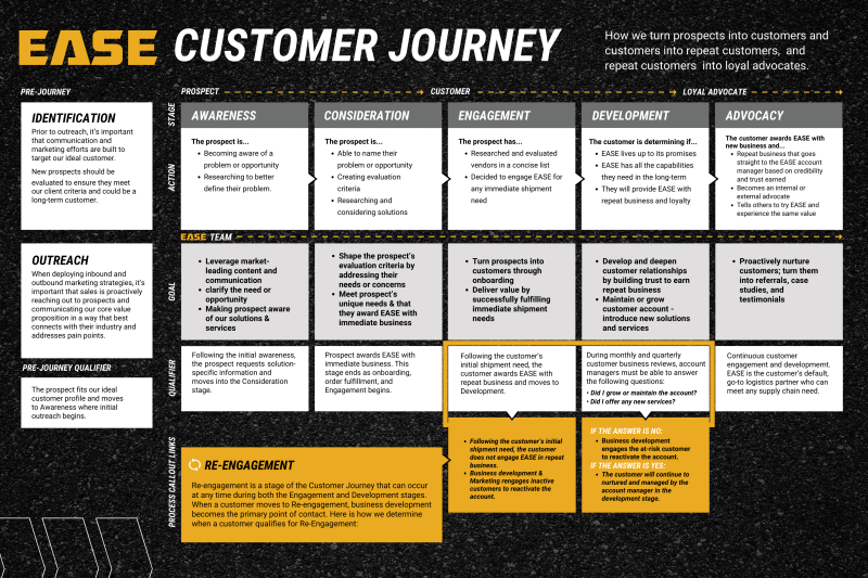 Each stage of the EASE customer journey, from initial awareness to post-purchase support, was defined by a set of key components meant to guide strategic decision-making and enhance customer experiences. Goals and objectives, touchpoints, qualifiers, channel strategies, metrics, and internal processes all played a role in shaping our customer interactions. The customer journey framework not only empowered us to meet customer needs more effectively but also drove business growth and fostered long-term loyalty.